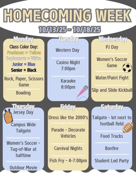 Homecoming week is filled with events that include students, faculty and alumni. The week starts off with Monday with Class Color Day, rock-paper-scissors tournament and bowling. Western Day, Casino Night and Karaoke are celebrated on Tuesday. Pajama Day, women’s soccer match, water and paint battle and slip-and-slide kickball are celebrated on Wednesday. Jersey Day, campus tailgate, tug of war during women’s soccer halftime and outdoor movie are celebrated on Thursday.